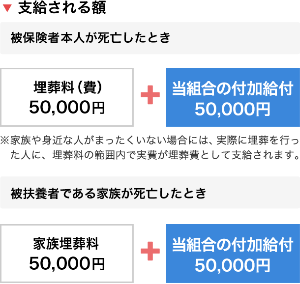 被保険者が死亡したときには、「本人によって扶養されていた遺族」に「埋葬料」50,000円が支給されます。また、被扶養者である家族が死亡したときには、被保険者に「家族埋葬料」50,000円が支給されます。