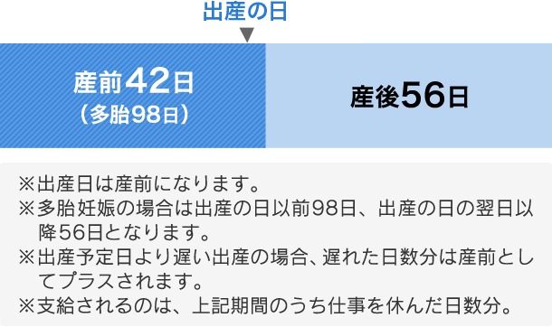 • ※産前産後休業期間:産前42日(多胎98日)、産後56日のうち、妊娠または出産を理由として労務に従事しなかった期間