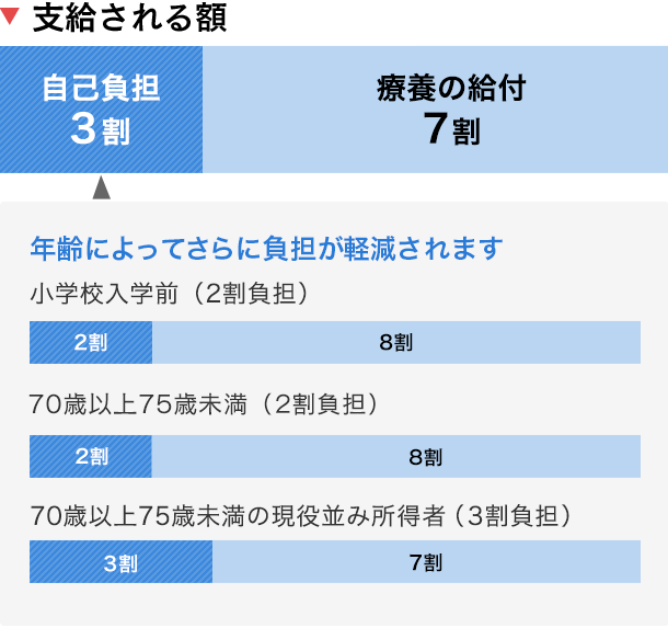 病気やけがをしたとき、健康保険を使うと、かかった医療費の3割を支払えば必要な療養が受けられます。なお、小学校入学前の子どもと70歳以上の高齢者は、窓口負担がさらに軽減されます。