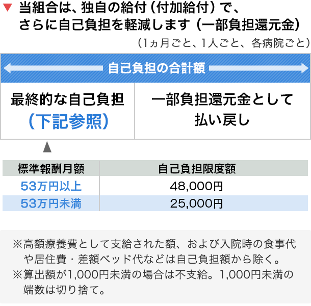 当組合の場合、病院の窓口で支払った1ヵ月の医療費から上記のとおり標準報酬月額に応じた自己負担分を差し引いた額を、後日、当組合から支給いたします。これを「一部負担還元金」(被扶養者の場合は「家族療養費付加金」)といいます。