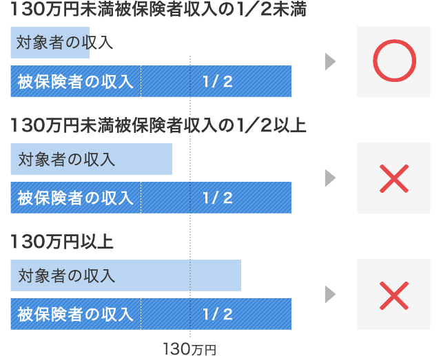 | 同居している場合 | 別居している場合 | 対象者の年収が130万円未満(対象者が19歳以上23歳未満(被保険者の配偶者を除く)※の場合は150万円未満、60歳以上または障害厚生年金の受給要件に該当する程度の障害者は180万円未満)で、被保険者の収入の2分の1未満であること | 対象者の年収が130万円未満(対象者が19歳以上23歳未満(被保険者の配偶者を除く)※の場合は150万円未満、60歳以上または障害厚生年金の受給要件に該当する程度の障害者は180万円未満)で、かつ、その額が被保険者からの仕送額より少ないこと |